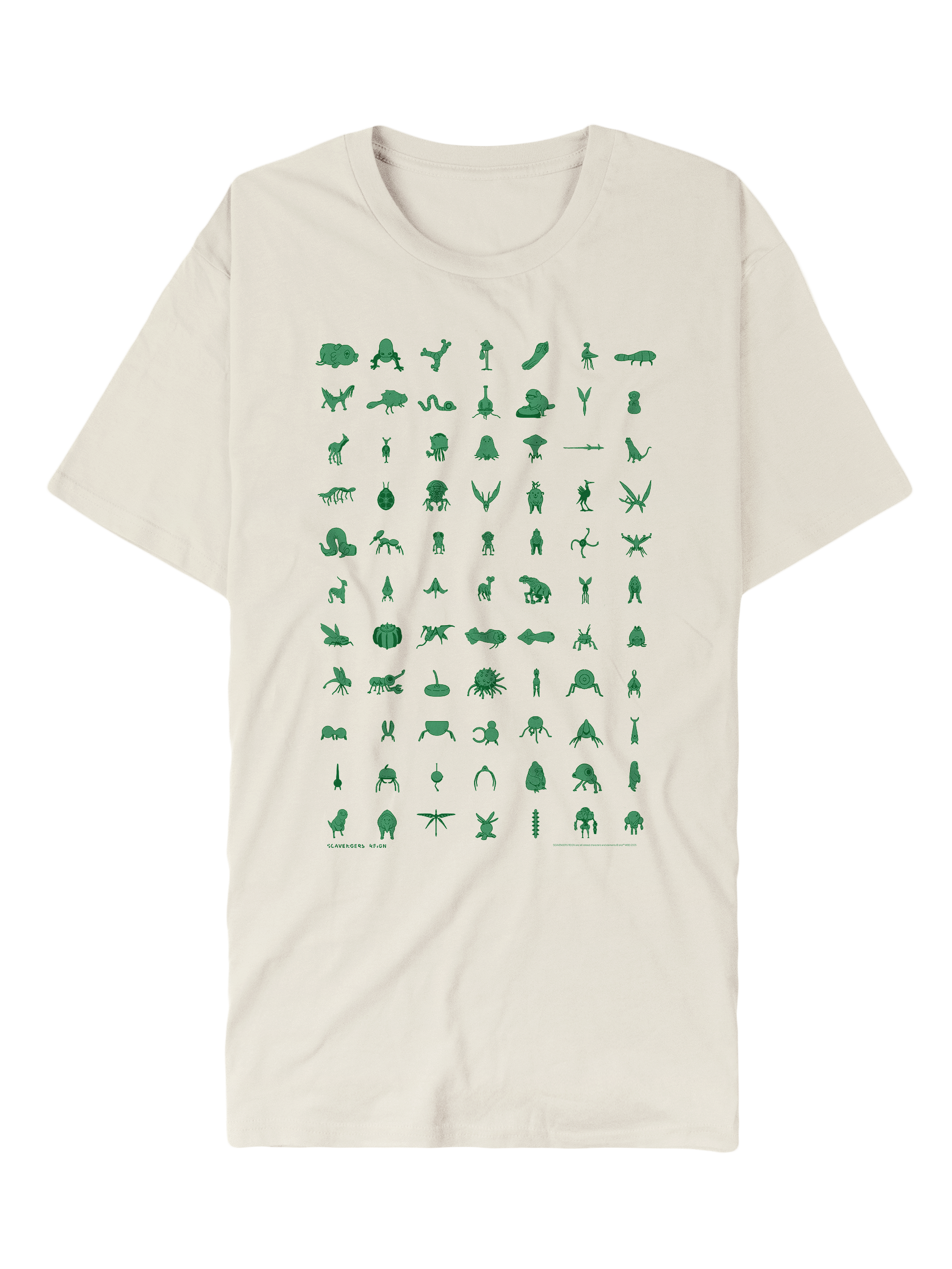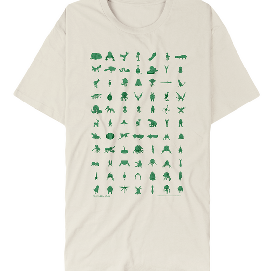 Ursula’s notebook has unfortunately been surrendered to the planet Vesta, left behind for future explorers, but luckily we were able to retain a glossary of many of her findings and catalogue them onto this crisp ivory tee. Brimming with all of Vesta’s most illustrious fauna, the Critters shirt is an artifact to be fawned over.