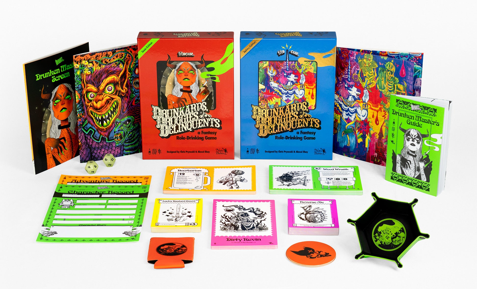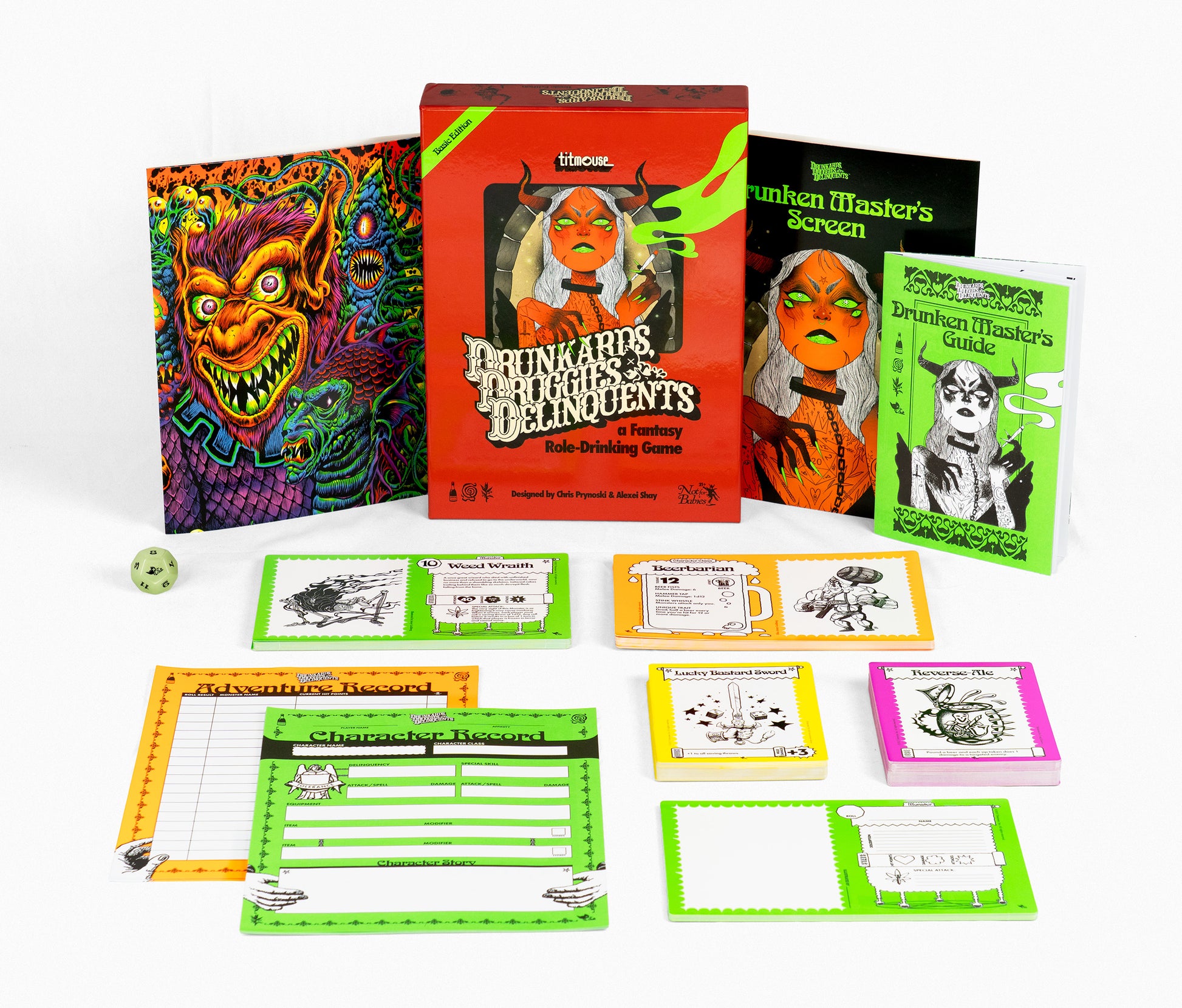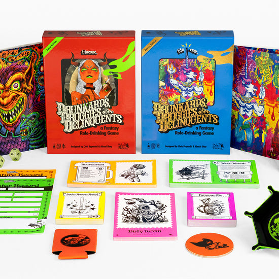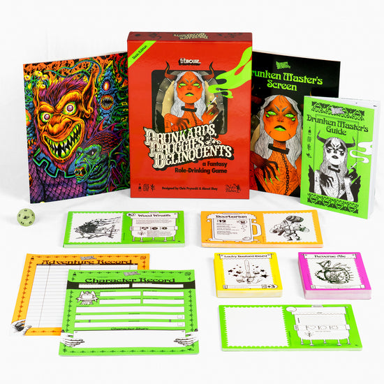 There’s room for sober friends to play too. Chug a bottled water, eat sour candy, or do a set of chin-ups. Everyone can enjoy the incredible artwork, twisted characters, and absurd bestiary of Monsters that make Drunkards, Druggies, & Delinquents a truly one-of-a-kind experience and the perfect way to spend a night around the table rolling dice with friends.