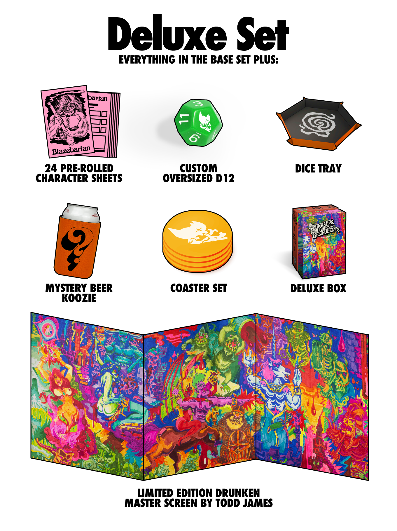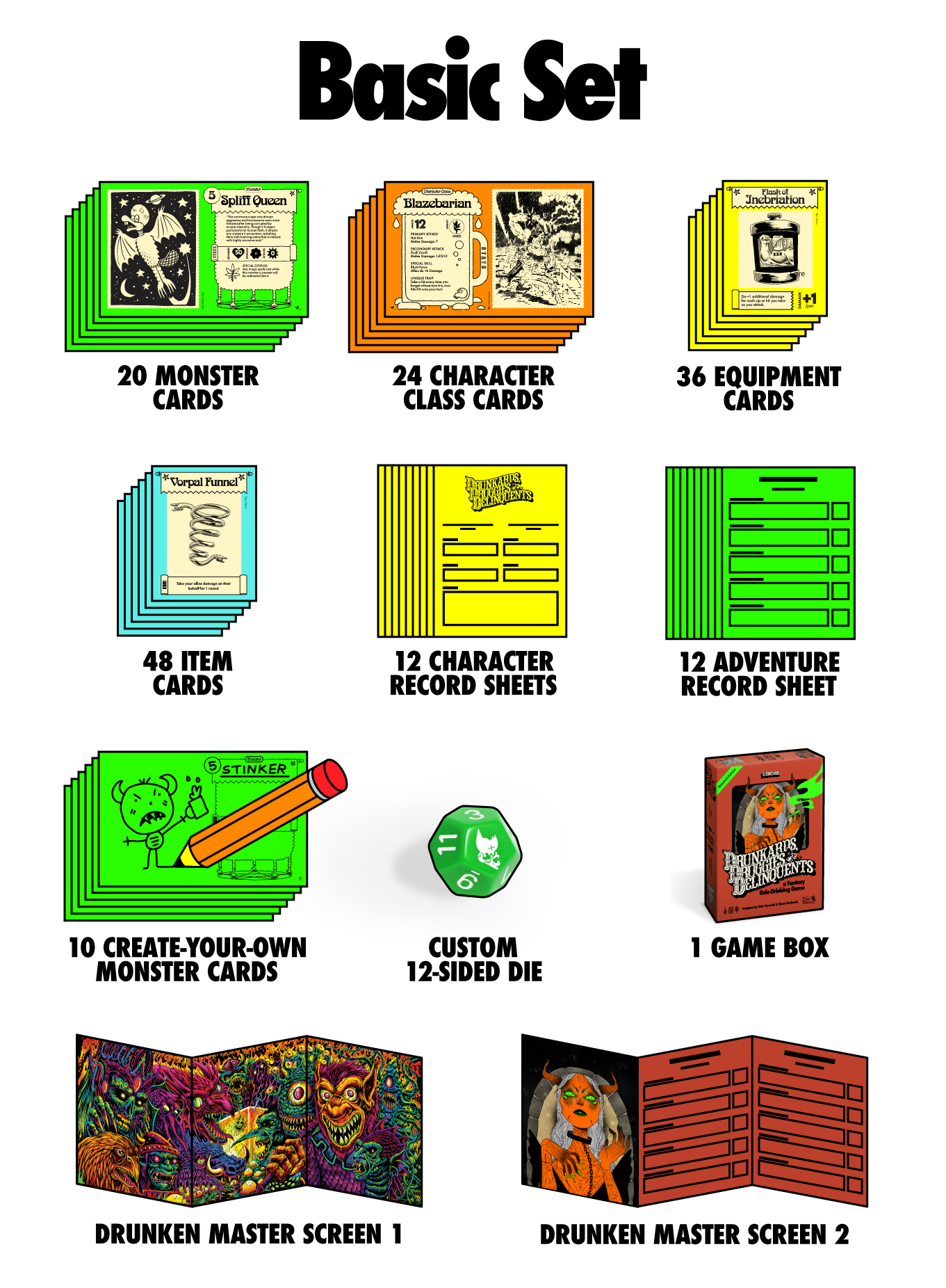 There’s room for sober friends to play too. Chug a bottled water, eat sour candy, or do a set of chin-ups. Everyone can enjoy the incredible artwork, twisted characters, and absurd bestiary of Monsters that make Drunkards, Druggies, & Delinquents a truly one-of-a-kind experience and the perfect way to spend a night around the table rolling dice with friends.